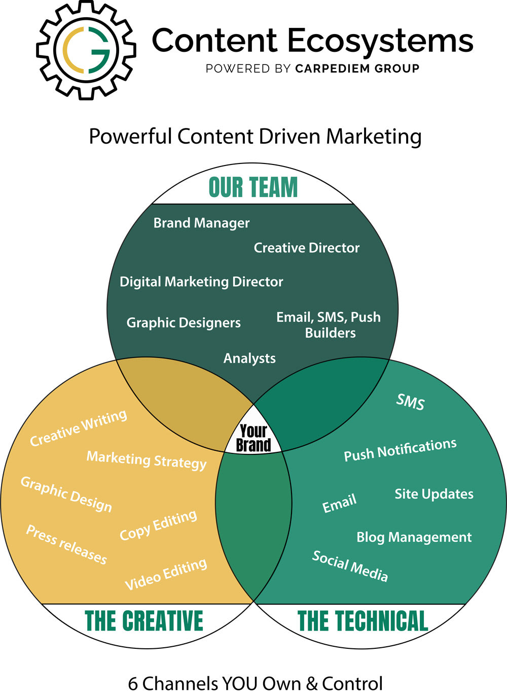 - Here at Content Ecosystems we create repeatable content marketing efforts that drive results with owned assets and marketing channels.
